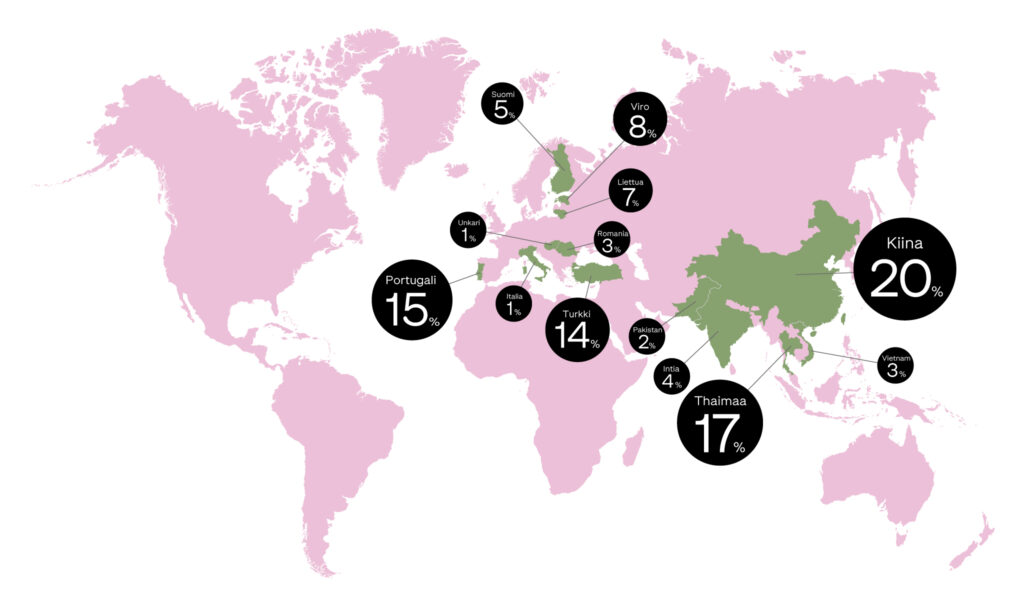 Osaavien ja monipuolisten sopimusvalmistajien avulla voimme tarjota asiakkaillemme laajan ja laadukkaan tuotevalikoiman. Tavoitteenamme on valmistuttaa tuotteemme aina kullekin tuotekategorialle parhaassa paikassa. Valmistuspaikasta riippumatta haluamme varmistua siitä, että tuotteemme valmistetaan arvojemme mukaisesti. Valitsemme sopimusvalmistajamme tarkkaan ja kiinnitämme valinnassa kaupallisten ehtojen lisäksi erityistä huomiota muun muassa työolosuhteisiin, työturvallisuusasioihin ja muihin ihmisoikeuskysymyksiin.