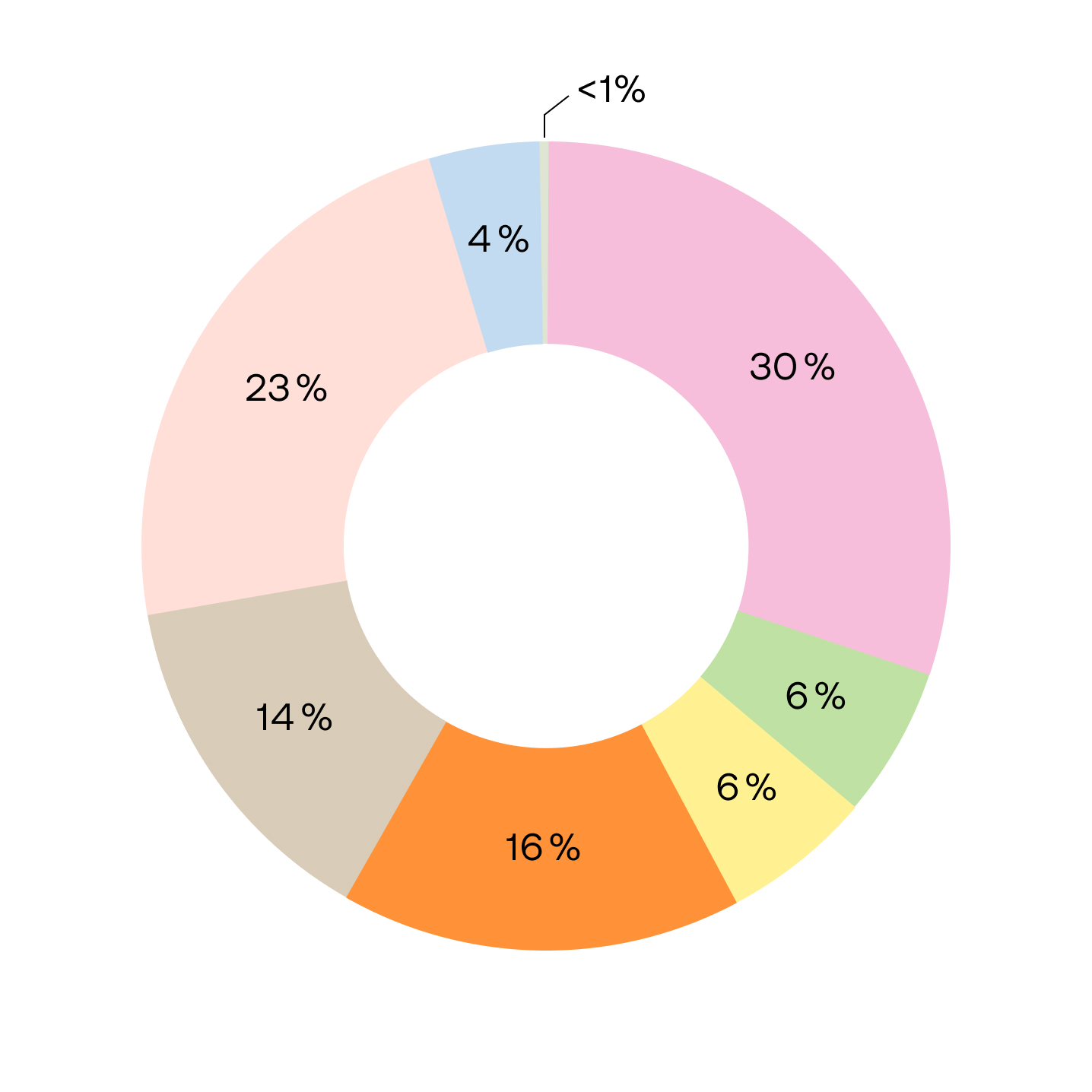 Vuodesta 2019 suorittamamme laskenta on osoittanut, että omista tiloistamme ja ajoneuvoistamme aiheutuvat suorat päästöt (scope 1) sekä ostamastamme energiasta aiheutuvat epäsuorat päästöt (scope 2) muodostavat alle 1 prosentin kokonaispäästöistämme, kun taas yli 99 prosenttia on arvoketjussamme syntyviä epäsuoria päästöjä (scope 3). Suurin osa scope 3 -päästöistä on peräisin ostetuista tuotteista ja palveluista, myytyjen tuotteiden käytöstä ja logistiikasta. Arvoketjun vaiheiden päästöt ovat tarkemmin alla olevassa kuvassa.